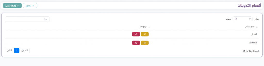 3) يمكن اضافة قسم تدوينات جديد عن طريق الضغط على اضافة جديد ثم اختيار اسم للقسم والضغط على حفظ