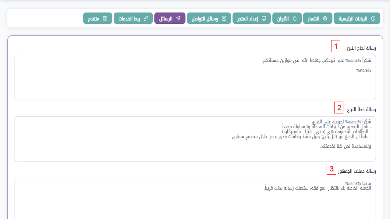 %name% – يمثل اسم التبرع وسيتم تبديله بشكل تلقائي من النظام