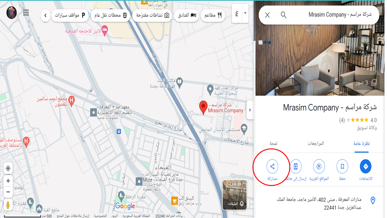 1) فتح موقع الجمعية على خرائط قوقل ثم الضغط على زر مشاركة