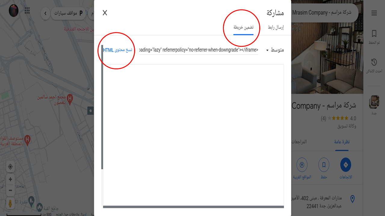 2) الضغط على تضمين خريطة > ثم الضغط على نسخ محتوى HTML