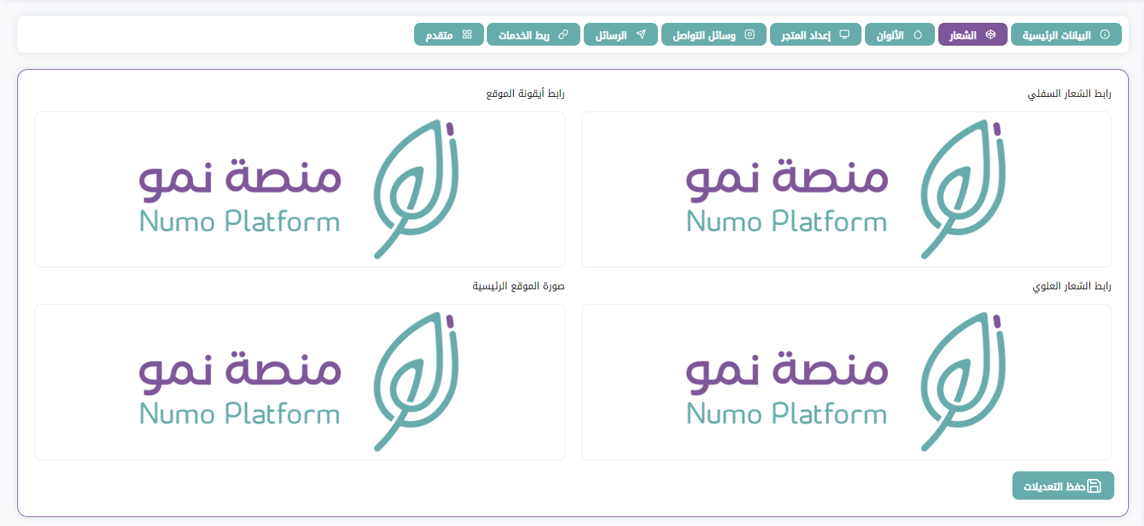 1) من القائمة الموجودة في جهة اليمين نقوم باختيار الإعدادات الرئيسية > من الأعلى نختار الشعار