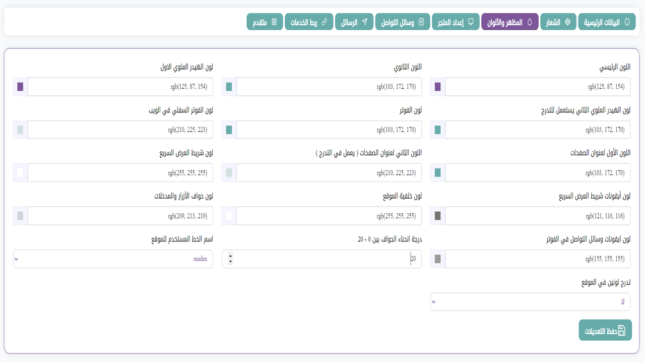 ملاحظة : يجب إضافة الالوان بصيغة RBG ( مثال : rgb(210, 225, 223) ) – يمكنك معرفة الوان شعارك عن طريق ملف الهوية البصرية الخاص بك او عن طريق استخدام اداة الألوان ColorPick Eyedropper (تعمل الأداة على متصفح قوقل كروم فقط )