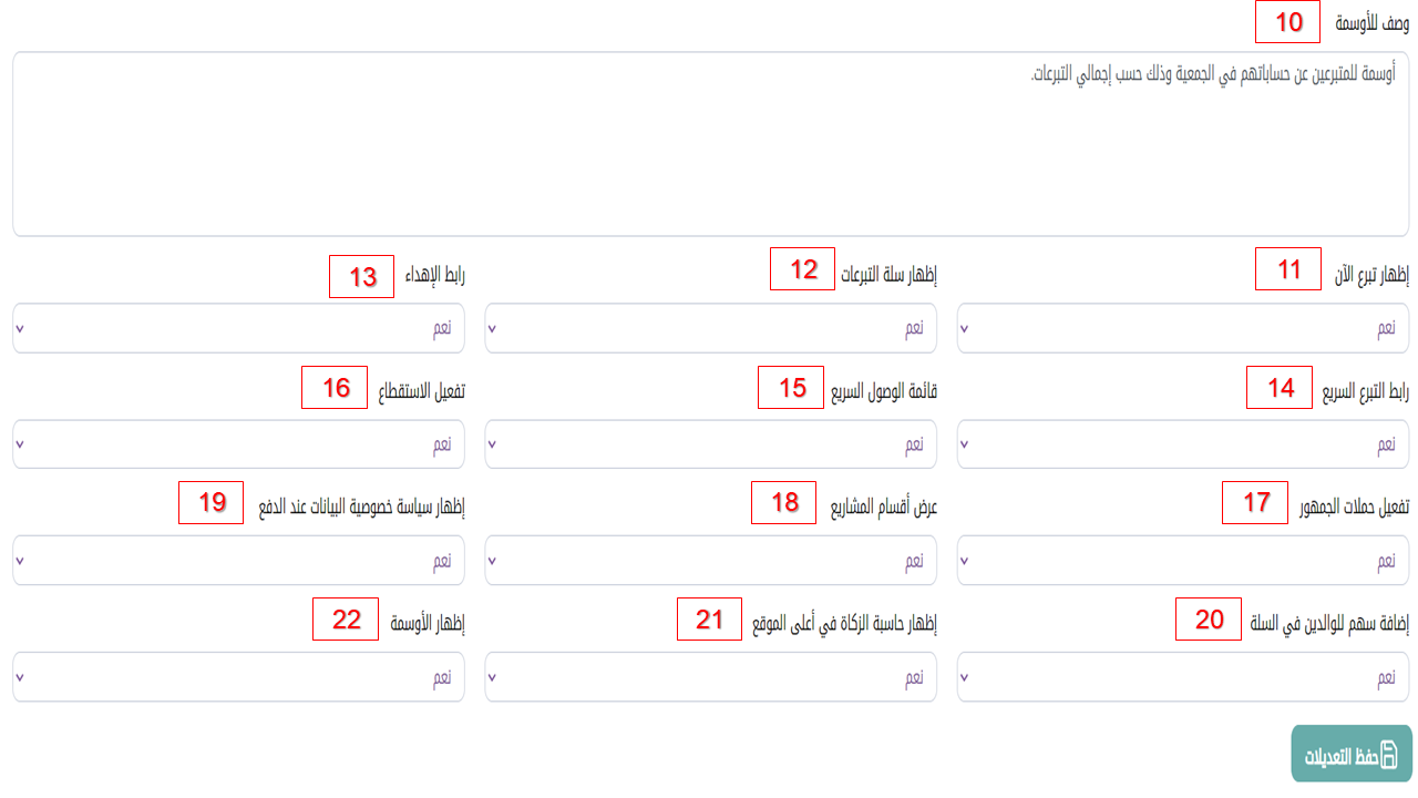 اقل تبرع في الإهداء : الحد الأدنى لقيمة الإهداء ( لا يتم قبول إهداء التبرع في حال كان اقل من هذا المبرغ وسيظهر تنبيه بذلك للعميل )
